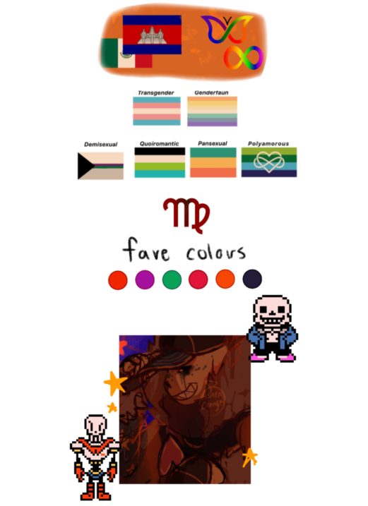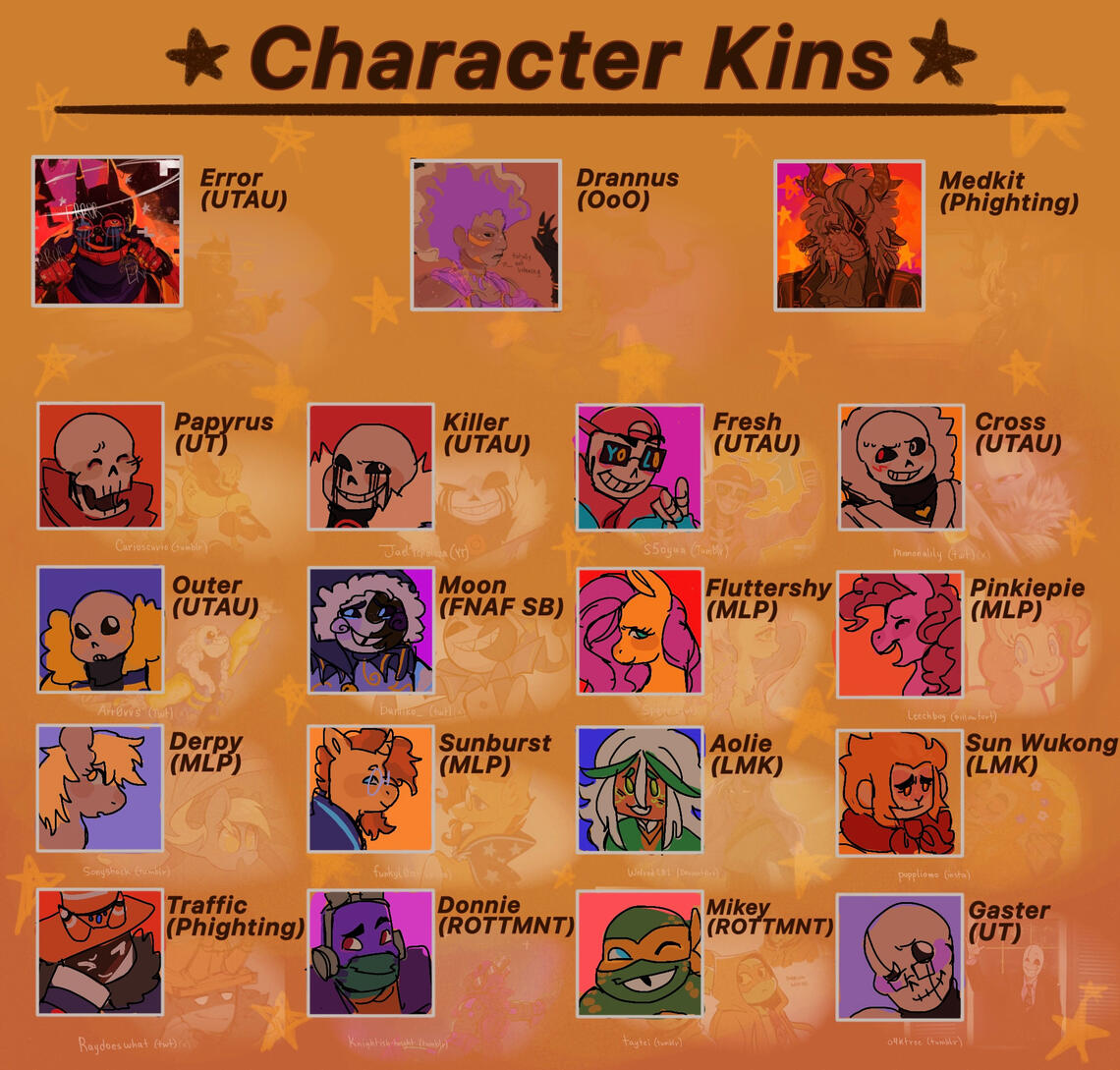 Phighting! (Roblox), , MHA (My hero Academia),Bittersweet by AJ (tiktok), Forsaken (c00lkidd),LMK(Lego Monkie Kid), TOH(The Owl House), FNAF(Five nights at freddy’s), UT(Undertale, Underverse, AU’s), MLP(My Little Pony), ROTTMNT(Rise of the Teenage Mutant Ninja Turtles), Origins of Olympus, Fairytail Origins, Bishop’s Knife Trick, Don’t hug me I’m scared (DHMIS), object shows, honkai star rail, Alien Stage, Good Omens, Spiderman, Pressure (roblox), TNaR (Those Nights At Rachel’s), oc series stuff, personal ocs (currently, phighting, bittersweet, and a select few others